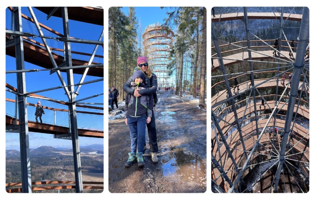 Po około 2 godzinach (z dziecięcym tempem i wieloma przystankami na przekąski, picie i niestworzone historie ) dotarliśmy na górę. Widok – bajka! Ale zanim podziwianie – trochę historii. Na szczycie znajdują się dwie wieże: stara, drewniana – niższa i znajdująca się tuż przy wyciągu, klimatyczna oraz nowa, nowoczesna i zdecydowanie wyższa wieża widokowa. To właśnie ona przyciąga teraz tłumy.